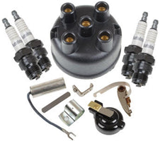 Contains points, condenser, rotor, spark plugs, and distributor cap.